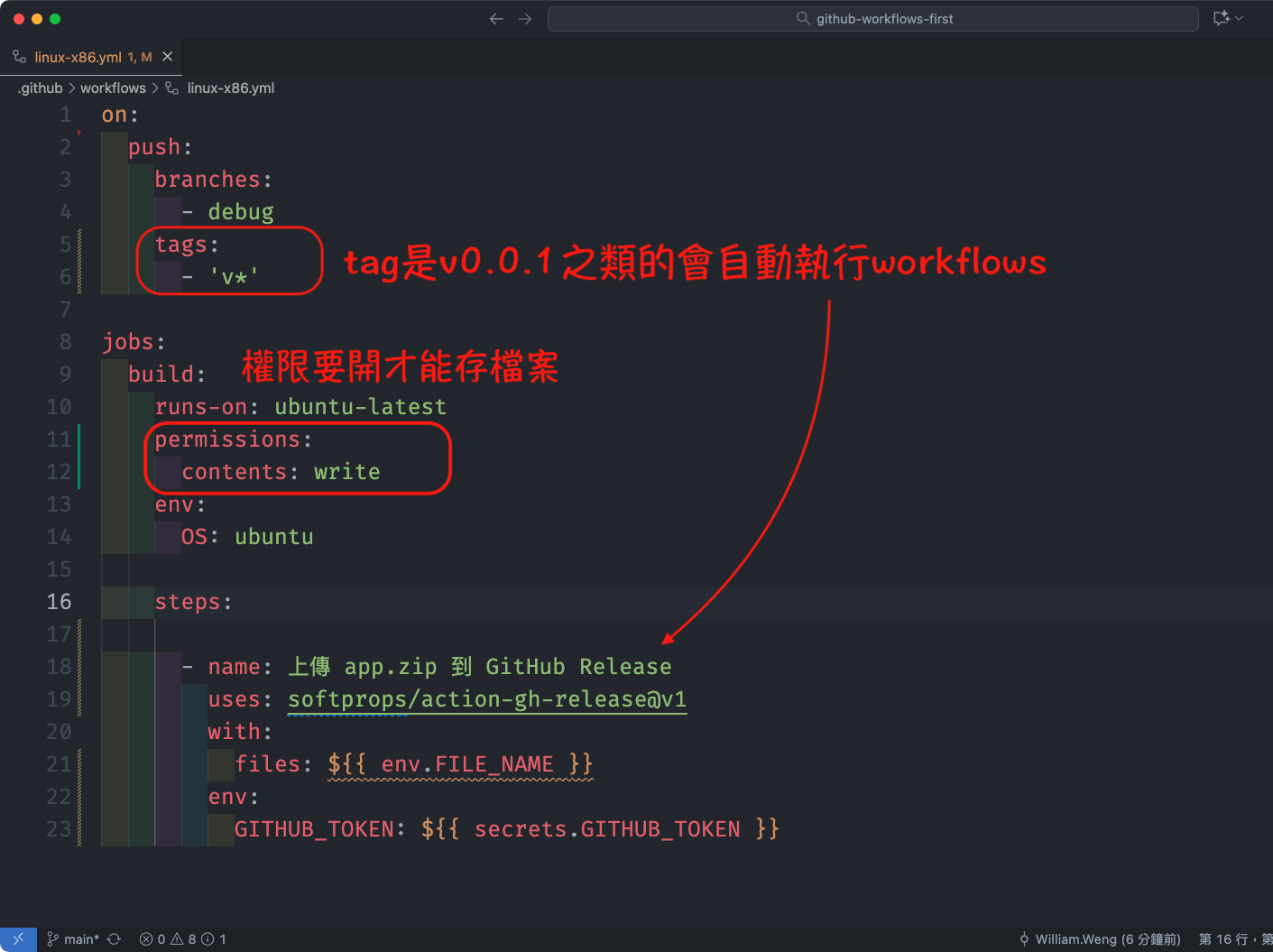 話說,筆者為什麼要學Workflows的,絕對不是因為要CI / CD,因為基本上,手機APP都是單人作業的,除非是很大型的專案,不然不太會有使用它的機會 (其實是筆者不會啦),主要還是在學Tauri製作小桌面APP,想要打包成各平台的執行檔,但是…筆者只有mac mini,那要怎麼辦呢?就可以使用GitHub Workflows,來自動打包成各平台的執行檔,雖然說,還是要實際上到各平台測一下才知道能不能用…