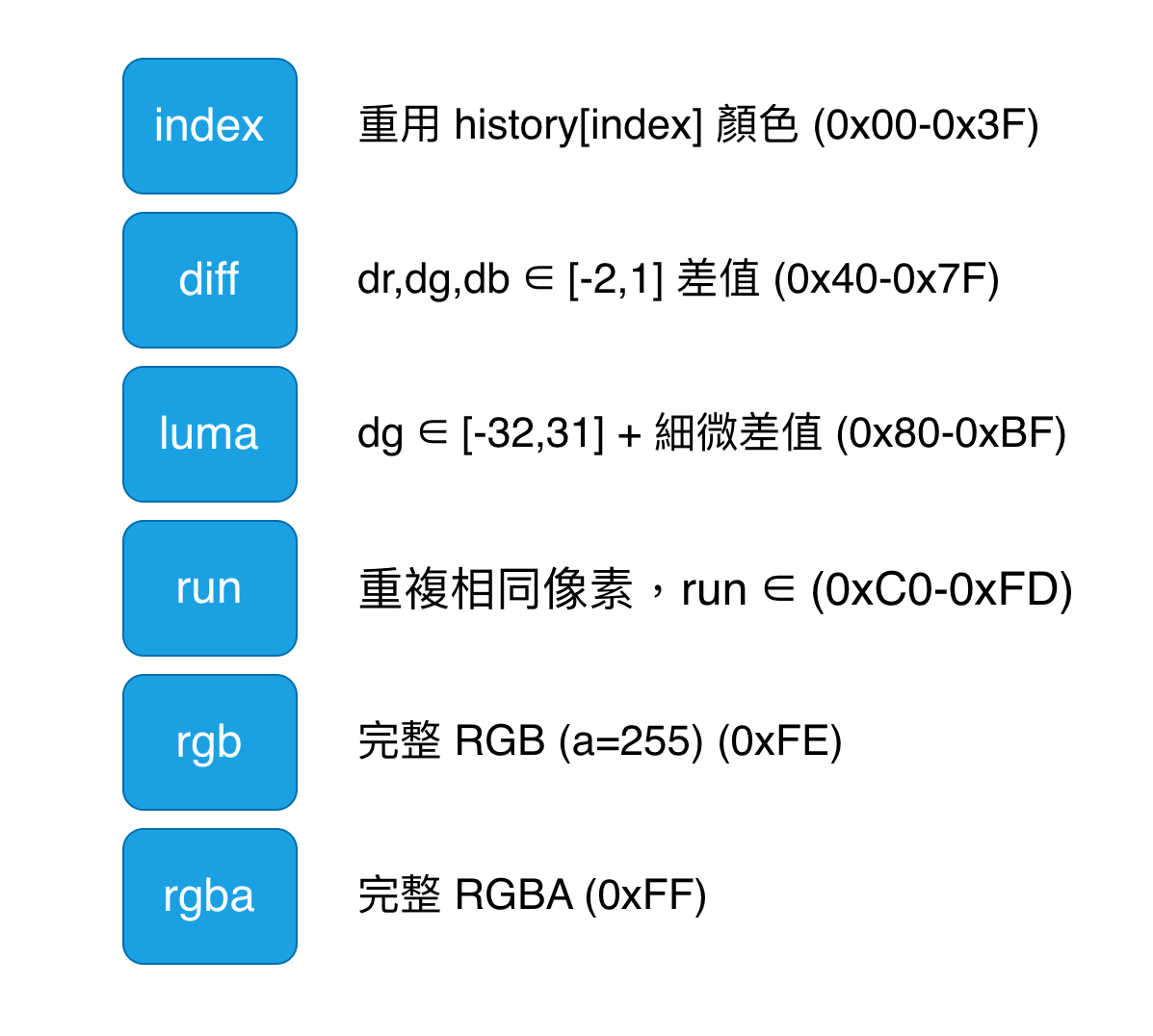 | QOI | 簡單的無損編碼,使用 Run / Index / Diff / Luma / RGB / RGBA | 是 | 編解碼很快、規格簡單、實作容易、對 CG 圖很有利 | 壓縮率通常不如 PNG 穩定,對照片和噪聲圖較弱 | CG 圖、插畫、UI、icon、截圖、純色區塊多的圖 |