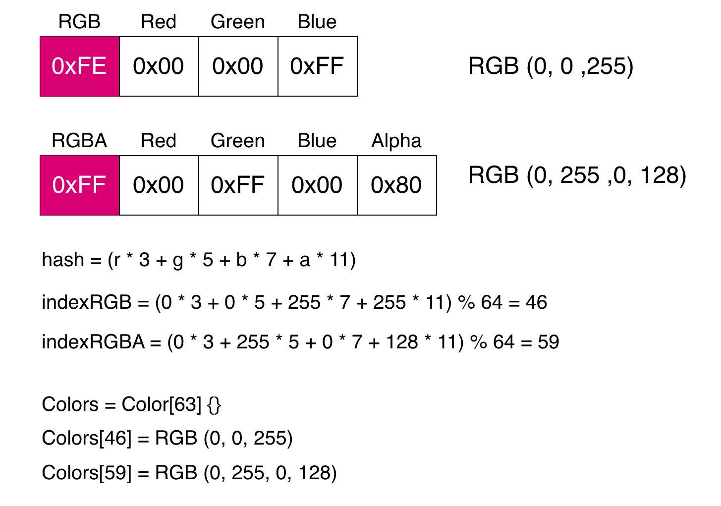 hash = (r*3 +g*5 +b*7 +a * 11)